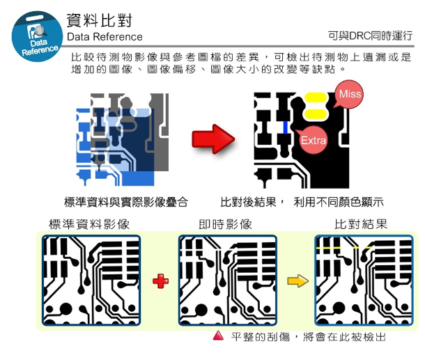 实时影像与标准数据比对,可检测遗漏或增加的图像、图像偏移及图像大小的改变;并可同时运作DRC逻辑比对,不需要重复扫描耗费额外的时间。