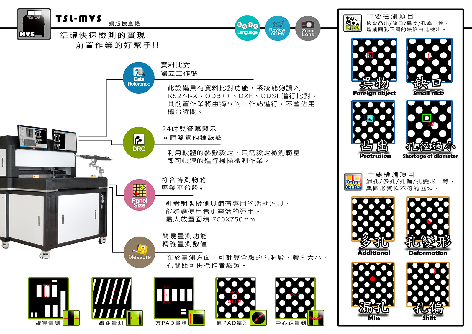 透过光学取像系统,快速检视钢版上的各种缺陷,降低因钢版不良而造成的报废和损失,以提升产品质量。具备可变倍率镜头组,可以针对不同规格的待测物进行调整,泛用性更高。