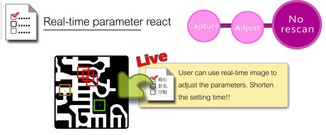 When parameter or image changed, system will update new defect detected results and display. No need to re-scan process.