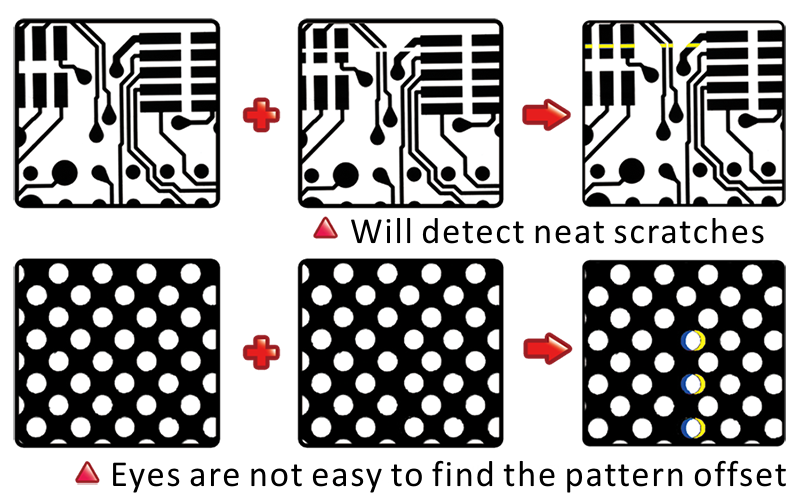 To determine defect by user's parameters and system embedded logic. Simple for operation and no need reference required. Inspect irregular broken/connection, pinhole, dirt, protrusion, violate minimum line/space width etc.