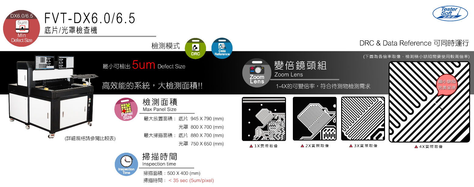 高效能系統,大檢測面積;可變動倍率鏡頭組,對應不同檢測需求;配備資料比對工作站,兩種檢測模式更完整。最小可檢5um缺點。
