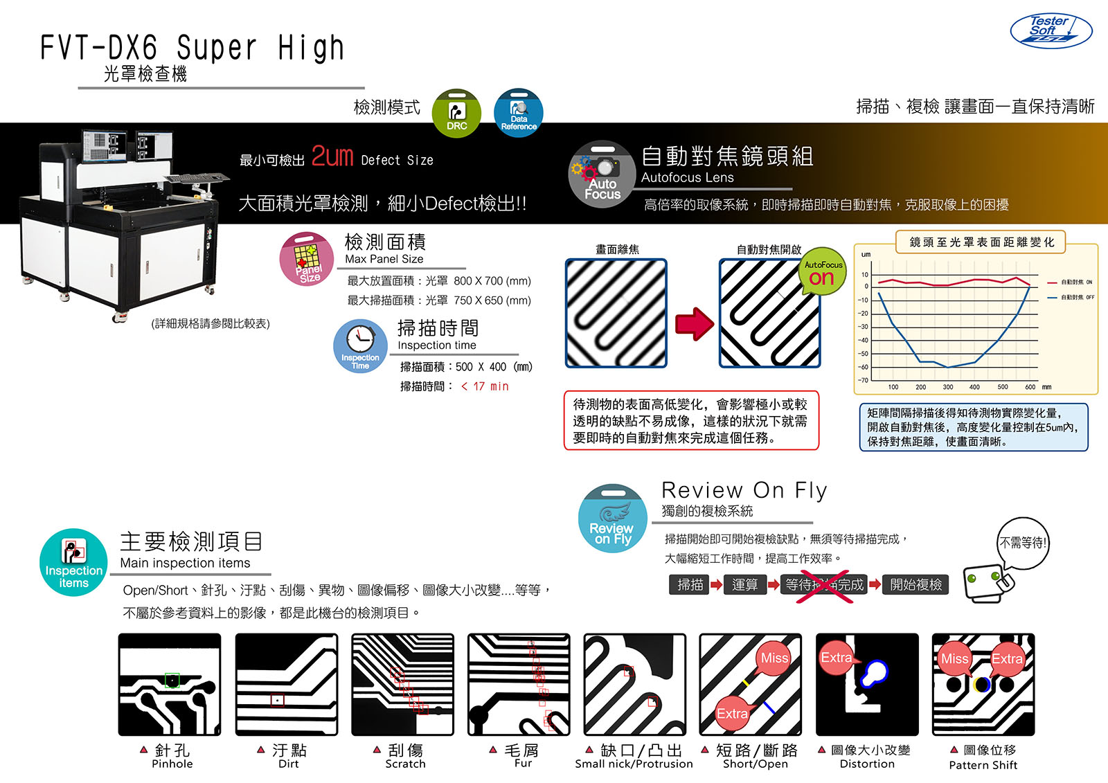 大面積光罩檢測,最細小缺陷檢出;自動對焦系統,解決離焦困擾;解析度更高,檢測更完整。最小可檢2um缺點。